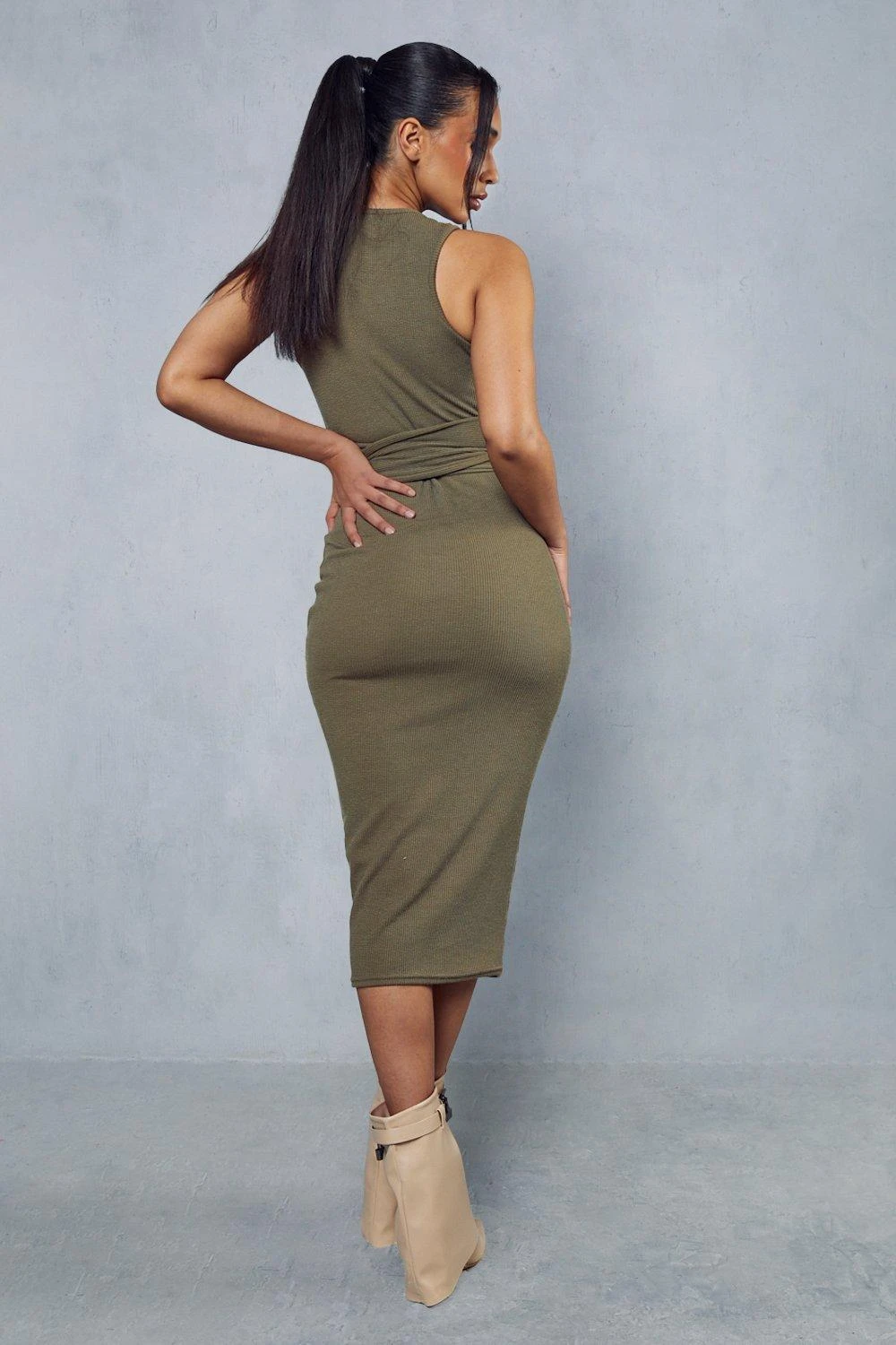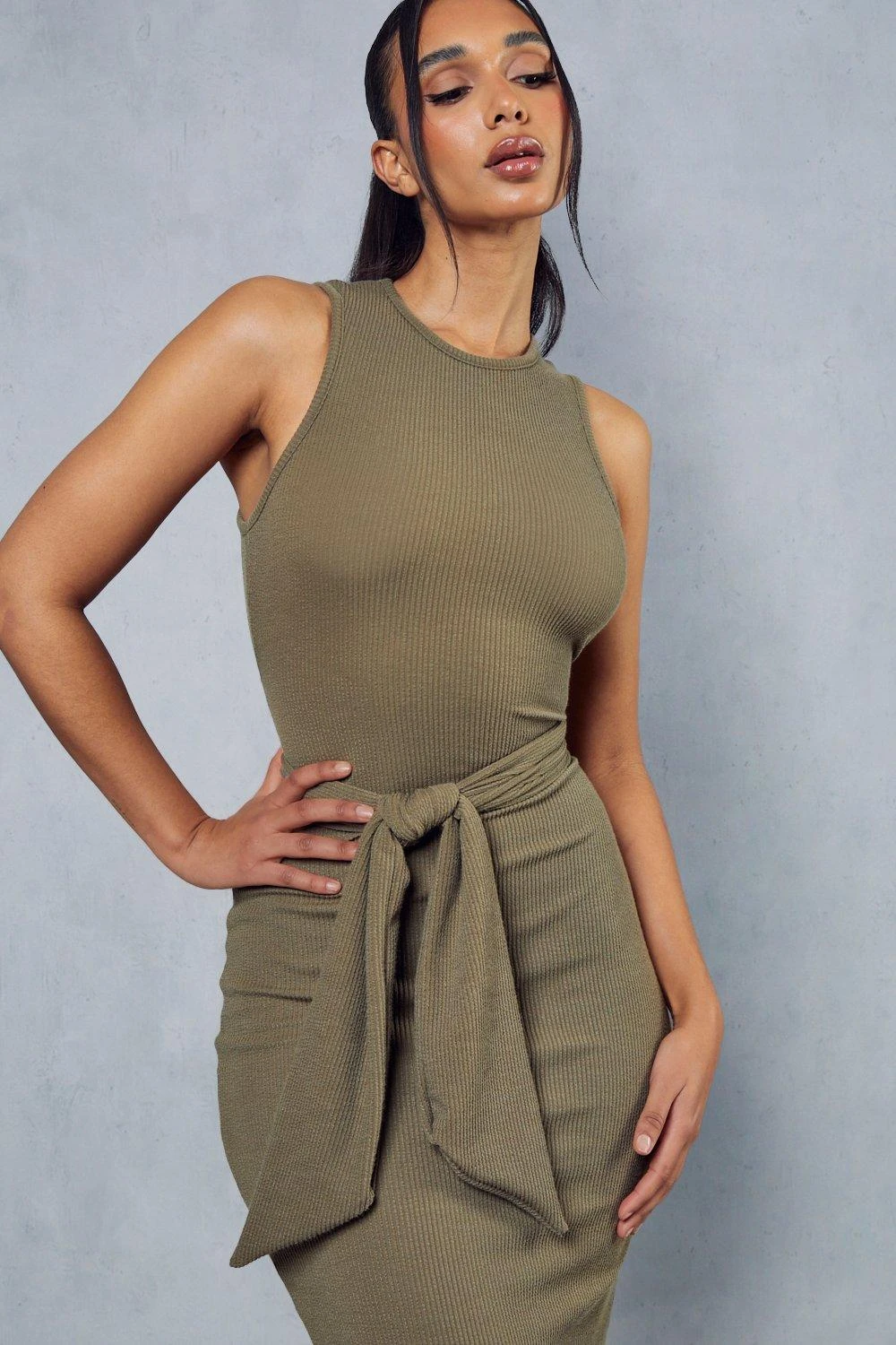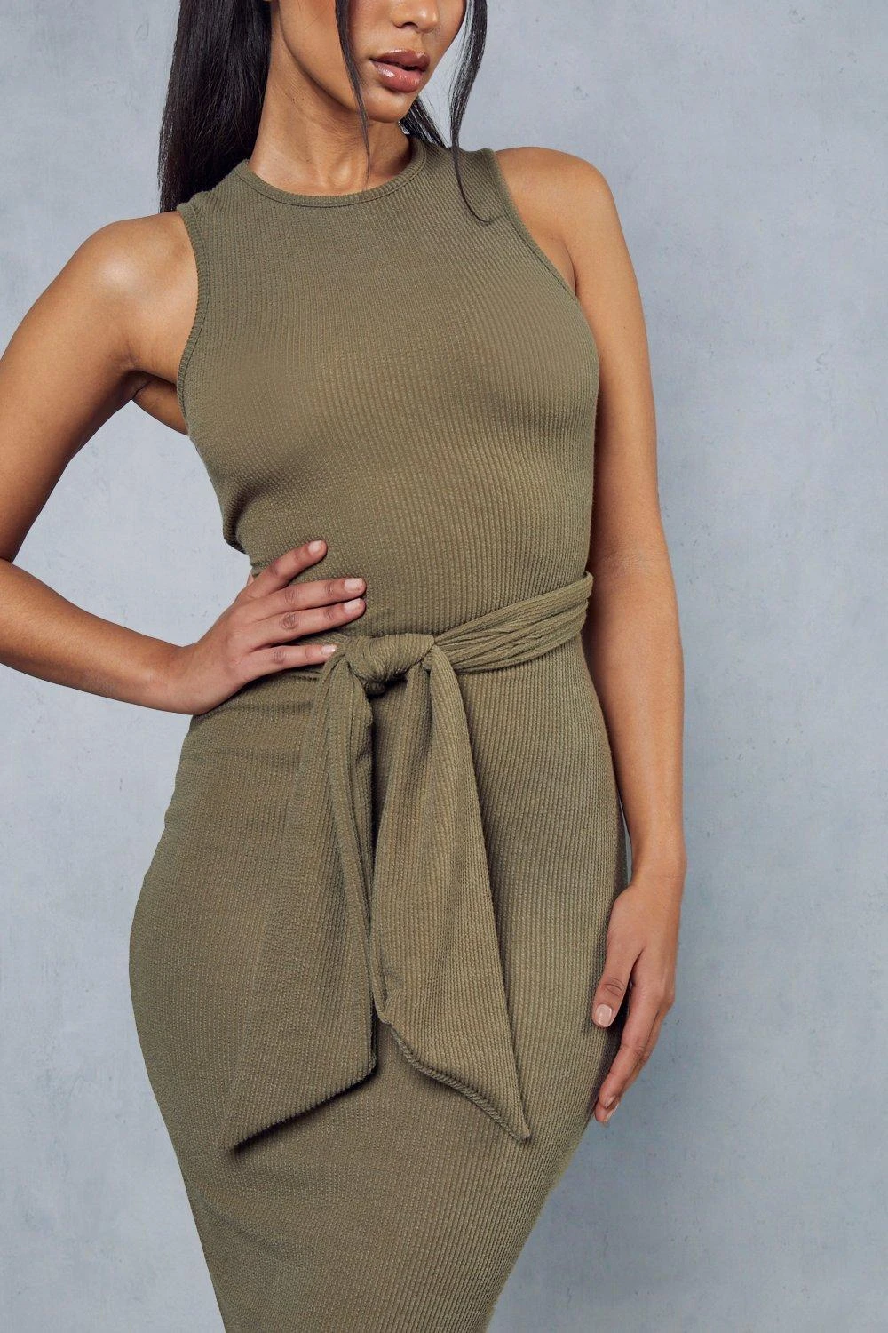 Rib Tie Waist Racer Neck Midi Dress